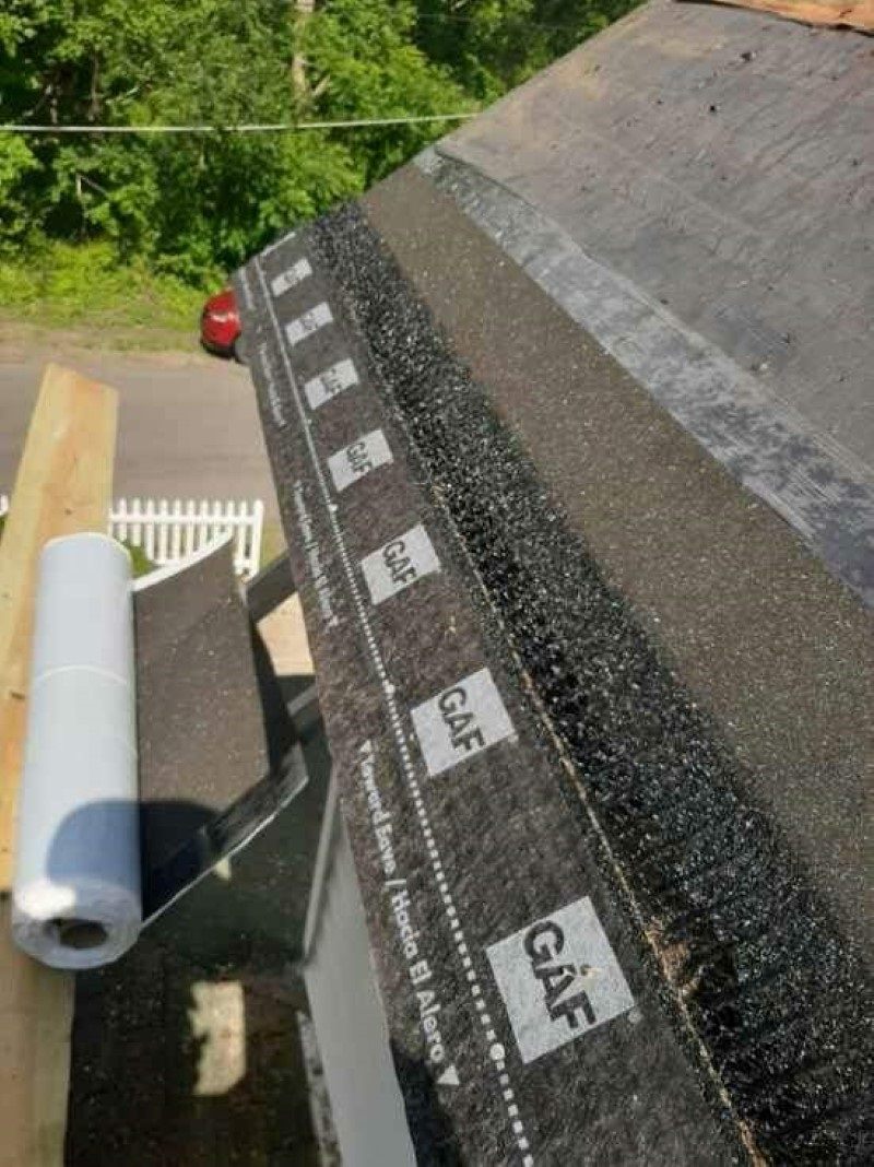 - GAF Weather Watch Ice and water shield was also installed minimum 6’ on the eaves, 18 inches on all roof to wall transitions including the rakes, 3’ feet in valleys, on roof penetrations and chimney flashings. Ice and water shield can give extra protection against wind driven rain and ice dams.
