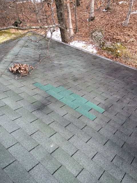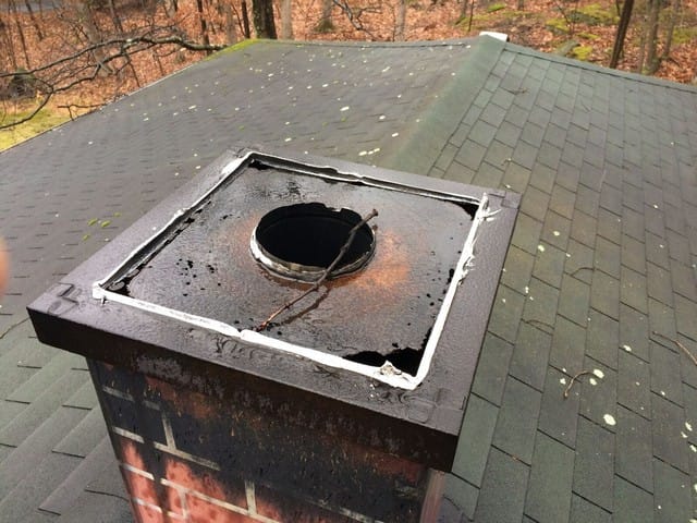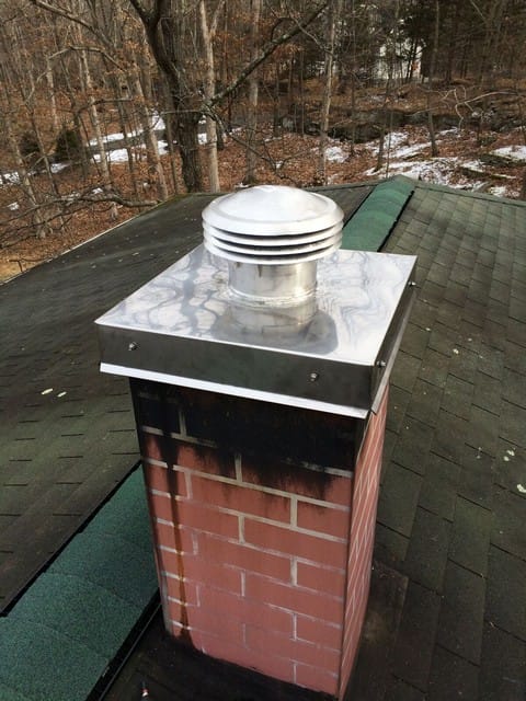 This project, on Erinns Trial in Chester New York, was a roof repair for a realtor. The home was for sale and the chimney cap was rotted through and leaking; there was no ridge vent, and there were some damaged shingles. We installed a new custom stainless steel chimney cap and installed a GAF Snow Country ridge vent at the peak to balance the ventilation. Then we installed an Owens Corning Supreme 3 tab shingles in Chateau Green on the repairs.