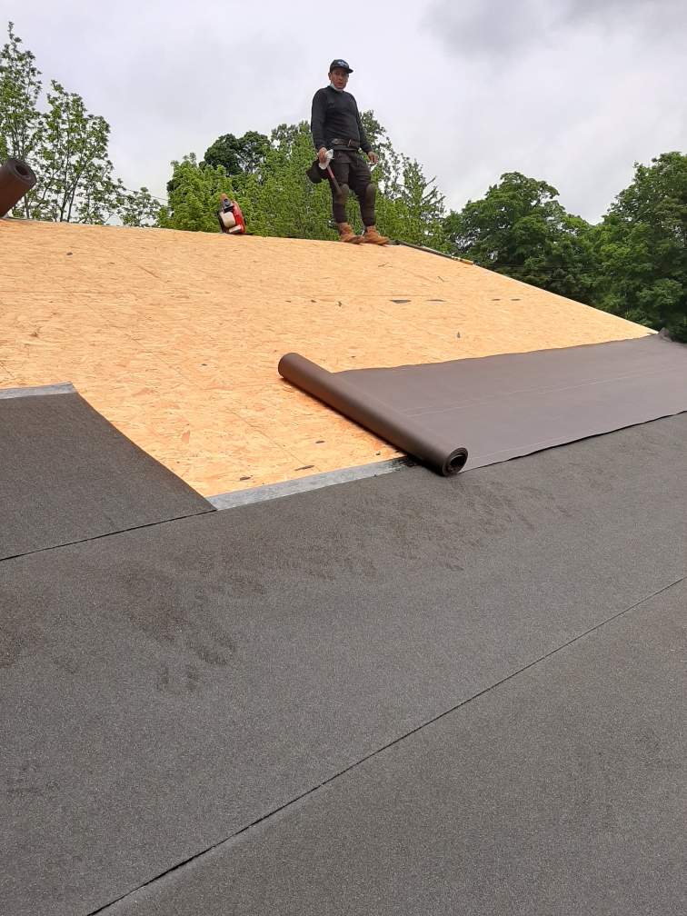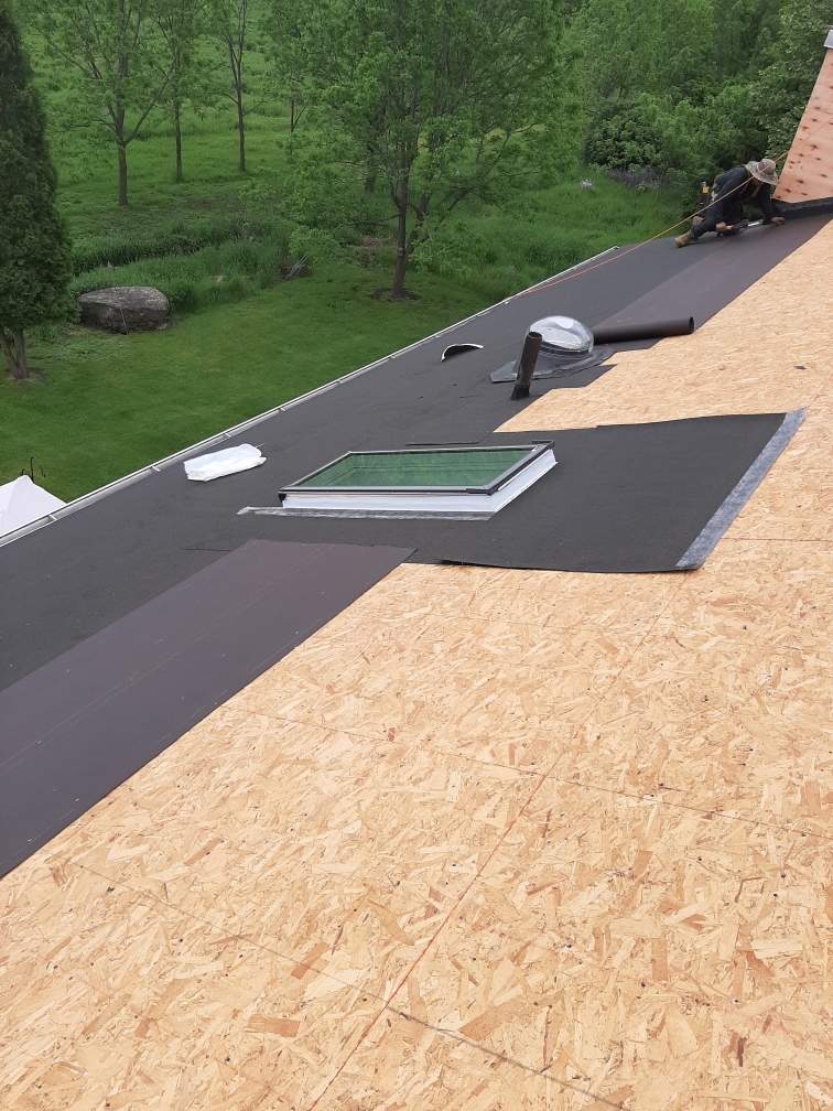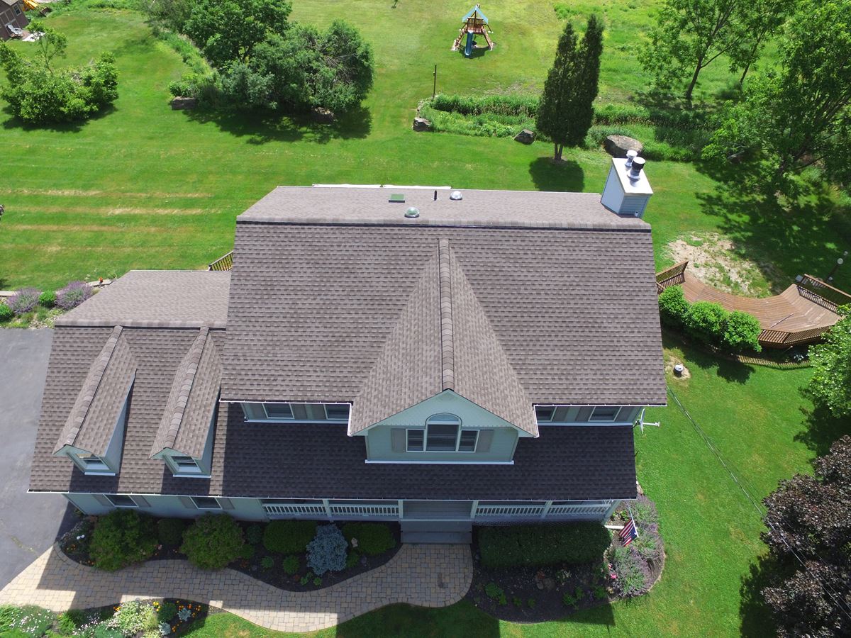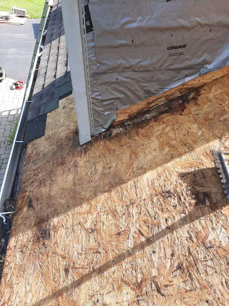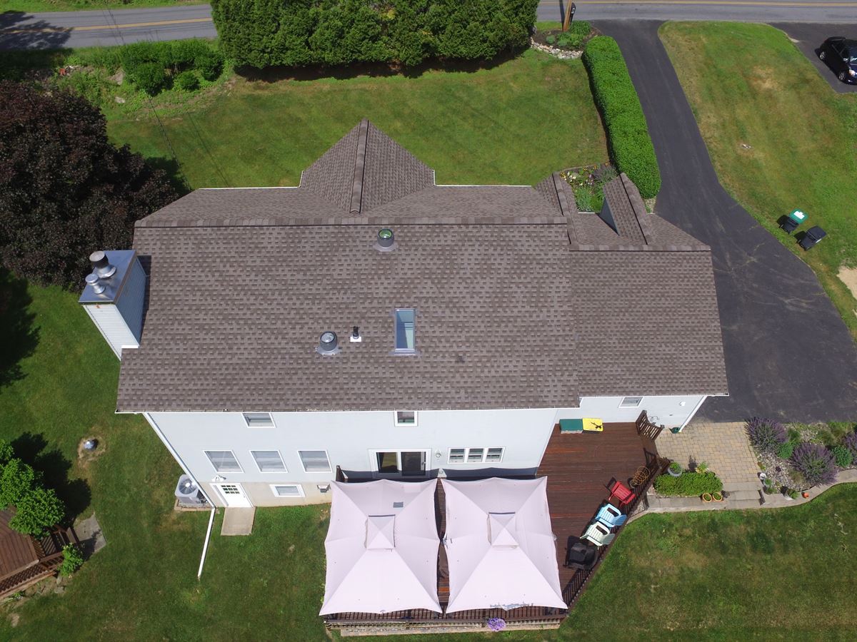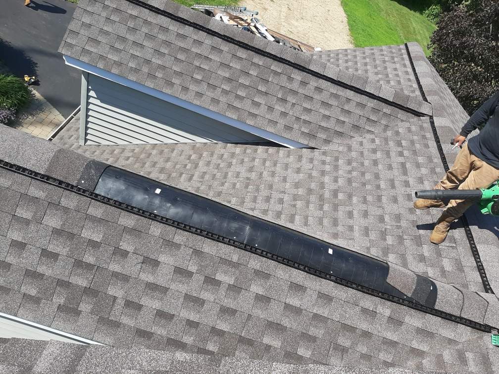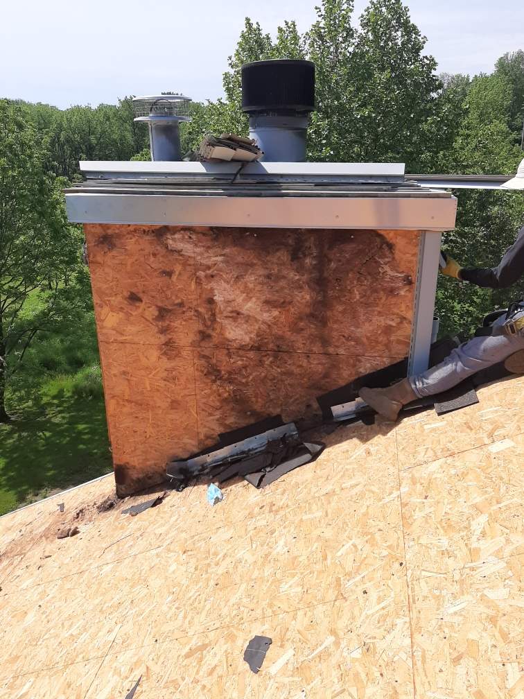 The customer’s roof was old and needed to be replaced. The customer wanted to be preventative and make sure that the roof was taken care of before it became an issue. First, we removed all shingles, and inspected the plywood to see if any needed to be replaced. Once replaced, Ice and water shield was installed on the lower eaves, and underlayment was installed on the remainder of the roof. Skylights and sun tunnels were also reinstalled. GAF Mission brown shingles we’re installed on the entire roof, along with white drip edge. There was also a leak in chimney flashing, and chimney cap which rotted the plywood. Any damaged plywood was replaced and recovered with siding. The whole project took about 3 days to complete.