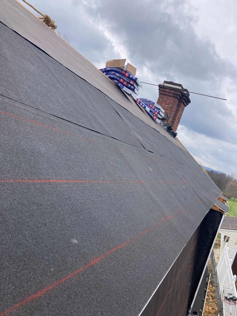 Any decking left exposed, unless the slope is too low, will be covered with felt paper. We use Shingle Mate synthetic felt paper underlayment. Shingle Mate is reinforced with fiberglass, making it more resilient to wrinkling. Felt paper is used to help prevent moisture buildup within the roofing system.