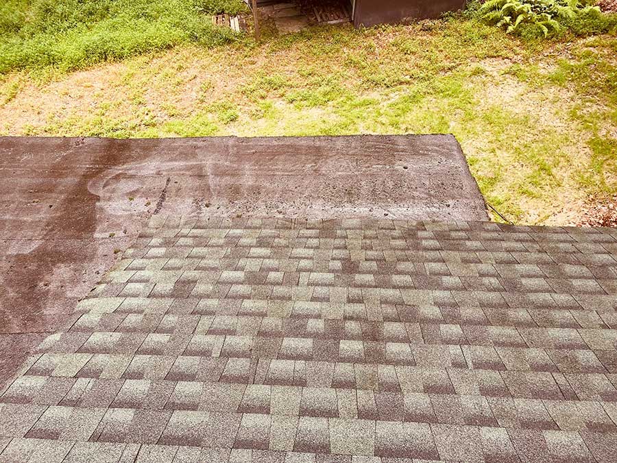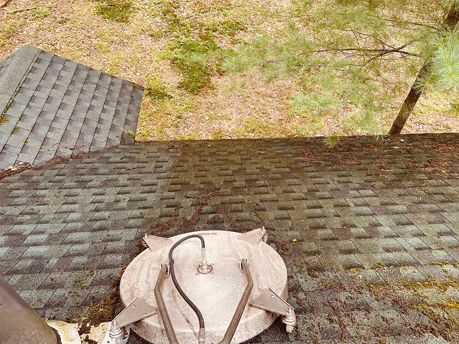 The customer already had part of the roof cleaned in the past and wanted to get it done again. Moss and algae were covering the majority of the roof. It’s always important to ensure that the roof doesn’t have too much moss if under a lot of shade. Moss can work its way under the shingle, letting water beneath your roof. It can also start to work at removing granules from the shingle, which in turn will reduce the life expectancy of your roof. There are many ways to help reduce algae and moss growth on the roof, one of which is to get a roof cleaning. Using our roof cleaning formula and a low-pressure washing system, we removed the algae and moss from the roof. Typically, power washing companies will use a high-pressure wash and bleach to clean siding and sometimes roofs. Our roof cleaning process uses a low-pressure wash, so we don’t remove granules from the shingle. Also, bleach can be harmful to the environment, corrode metal, and be detrimental to plants. Our roof cleaning uses an eco-friendly formula that effectively cleans your roof while being environmentally friendly.