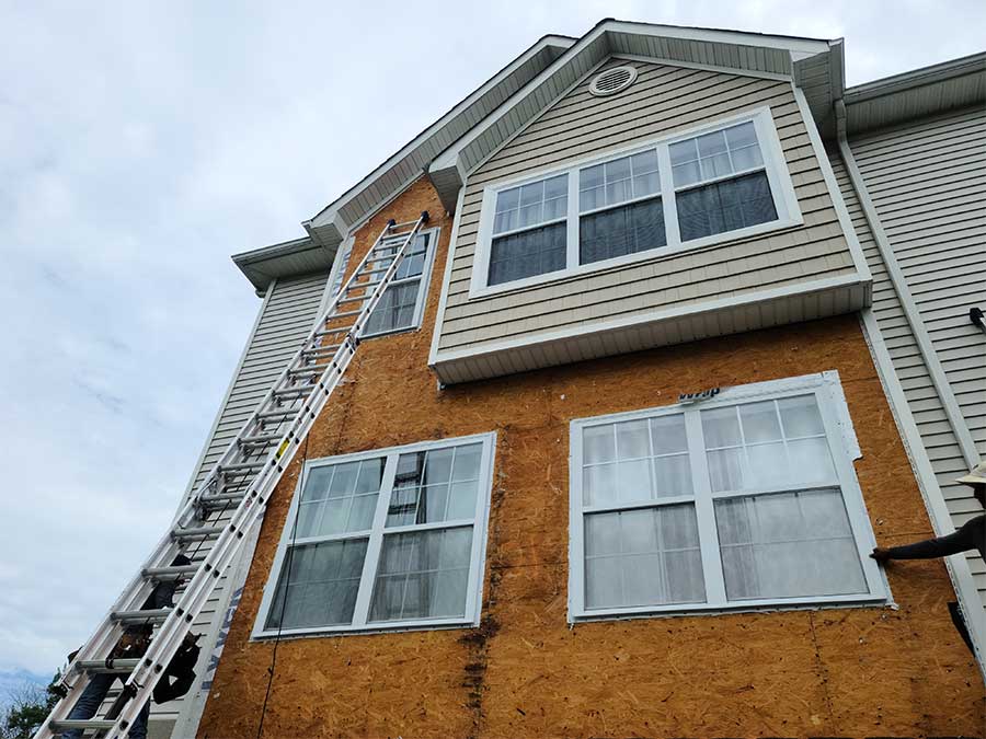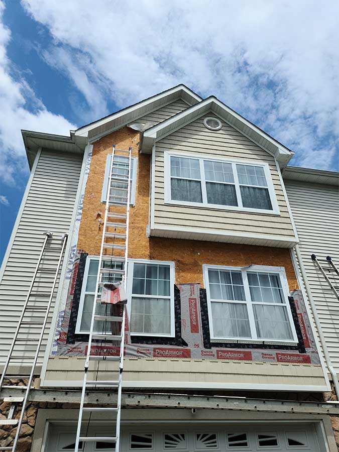 Water was leaking into this Monroe, NY home through their window since the last rainstorm. To prevent severe damage to the home, the homeowner needed to have this fixed immediately. We removed the siding off of that side of the house and removed all the house wrap behind it. Once the side of the house was bare, we inspected for plywood that needed to be replaced and recovered the entire side of the house with Owens Corning ProArmor Synthetic Underlayment. The underlayment was sealed to the windows using Barricade Flashing Tape to ensure no water could get between the two. The siding was reinstalled on top to finish the repair. It took about a day and a half to finish.